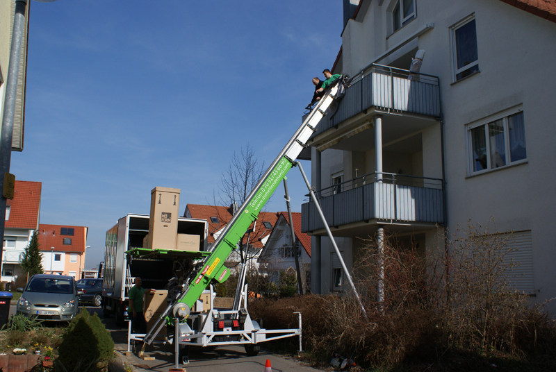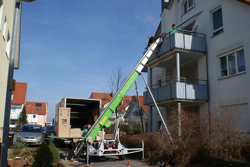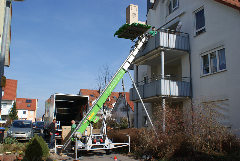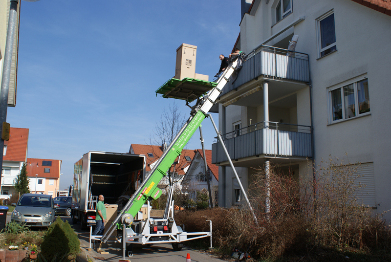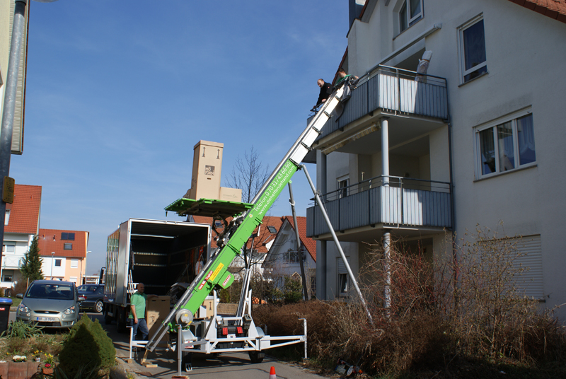 Der Transport der Möbel durch das Treppenhaus ist zeitaufwendig und schweisstreibend - gerade bei sperrigen Möbelstücken ist es oft eine ziemliche Schinderei, bis man die "guten Stücke" unversehrt durch das Treppenhaus "navigiert" hat. Der Schwierigkeitsgrad erhöht sich mit der Anzahl der zu bewältigenden Stockwerke. Durch den Einsatz unseres Möbelaufzuges bei Ihrem Umzug ersparen wir Ihnen uns uns diesen Teil der Arbeit komplett - das schont nicht nur die Muskeln und Gelenke unserer Möbelpacker sondern schenkt Ihnen auch noch wertvolle Lebenszeit, denn der Umzug geht so viel flotter!