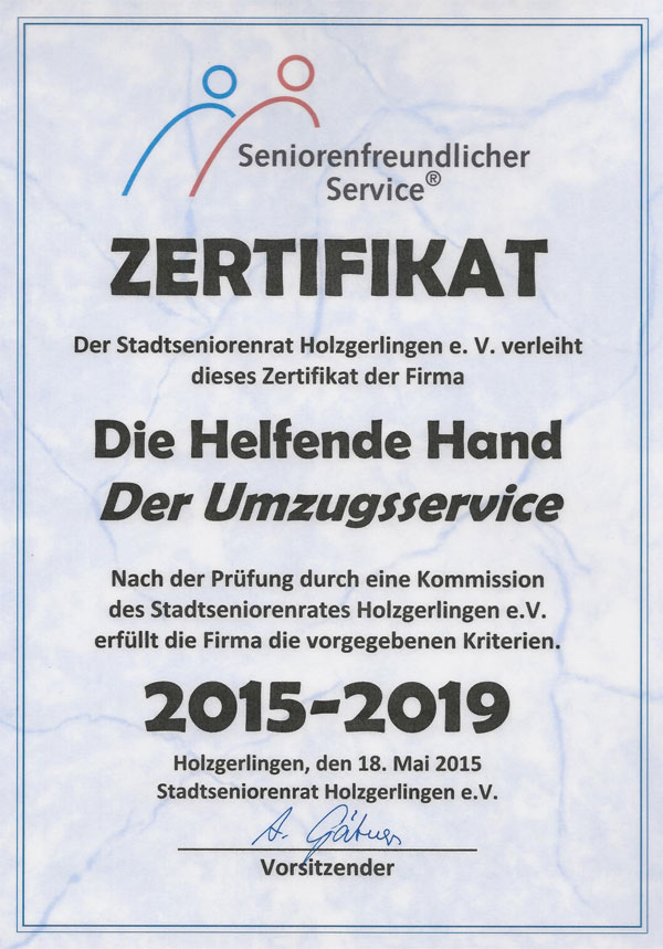 Zertifikat "Seniorenfreundlicher Service" 2015 für Die Helfende Hand