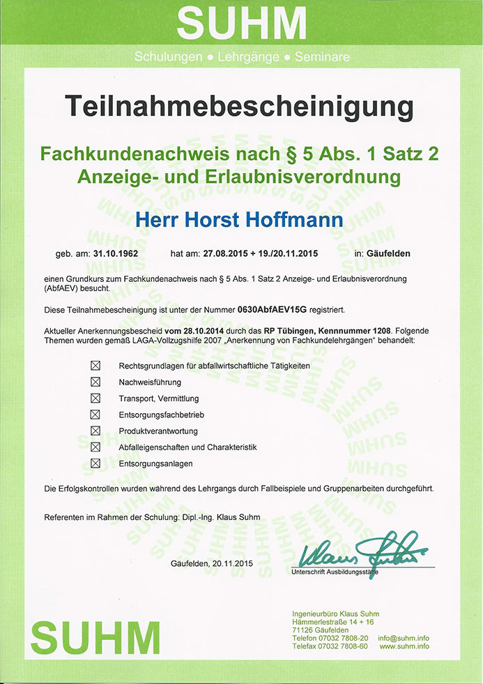 Weiterbildung steht bei der Helfenden Hand hoch im Kurs. Damit unsere Kunden im Bereich der Entrümpelungen und Haushaltsauflösungen sich in größter Sicherheit wiegen können, hat sich der Gründer und Inhaber der Helfenden Hand, Horst Hoffmann mit dem Fachkundenachweis nach § 5 Abs. 1 Satz 2 (AbfAEV) auseinander gesetzt und den Lehrgang beim Ingenieurbüro Klaus Suhm in Gäufelden erfolgreich bestanden.